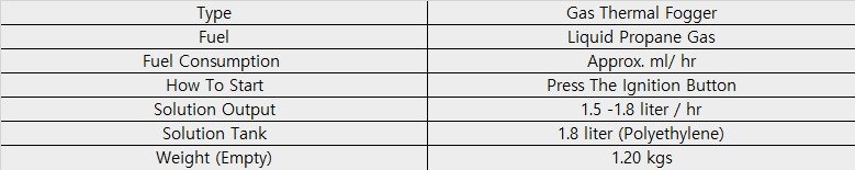 LPG is used to heat the element, and the fog is produced when the hand pump is activated.