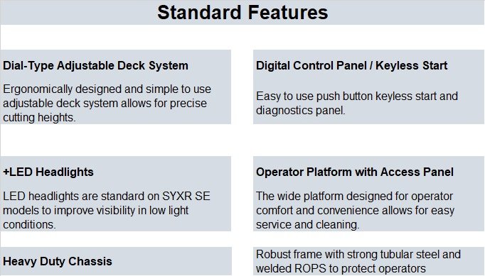 - The SYXR SE Series was designed for residential applications with property owners and hobby farmers in mind. With a Kohler Confidant™ engine combined with a Hydro-Gear® ZT-3200 transmission, the SYXR SE delivers reliable and hardworking performance. Owners can choose from a 48, 54 or 60 in mower deck, each with a fabricated, reinforced 10-gauge steel deck and standard notch blades that cut through the toughest turf.